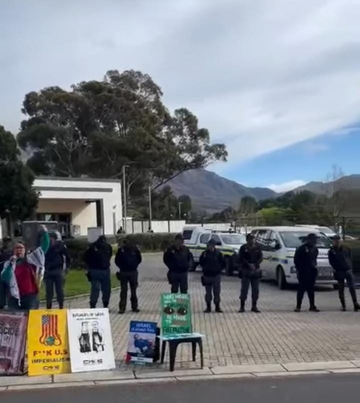 تظاهر مجموعة من المناصرين لفلسطين أمام السفارة الأمريكية في كيب تاون ، عبر المتظاهرون بالغناء وبلوحات فنية عرضوها خلال تظاهرهم عن موقفهم الداعم لفلسطين والذي يُطالب أميركا والعالم بإيقاف حرب الإبادة التي ينفذها الاحتلال الإسرائيلي بحق الفلسطينيين في قطاع غزة.